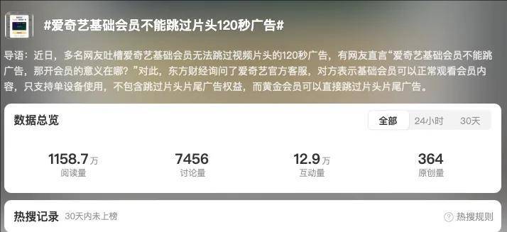 而這一熱搜話題的熱度還未消退,今日,愛奇藝又一次「光榮」的登上了熱搜,熱搜話題是,開了15塊一個月的愛奇藝會員,竟然連片頭120秒的廣告都無法跳轉了。