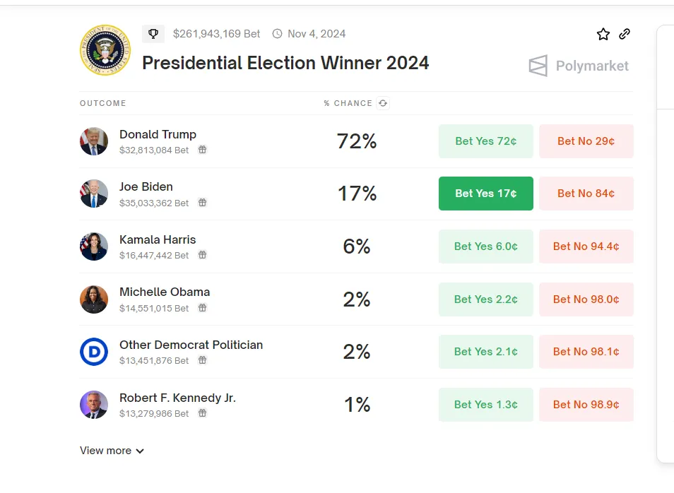 民意調查數據頁顯示了這一點,預測平台Polymarket的“2024美國大選”預測顯示,截至北京時間7月16日19:10,特朗普的勝率為72%,拜登僅為17%。