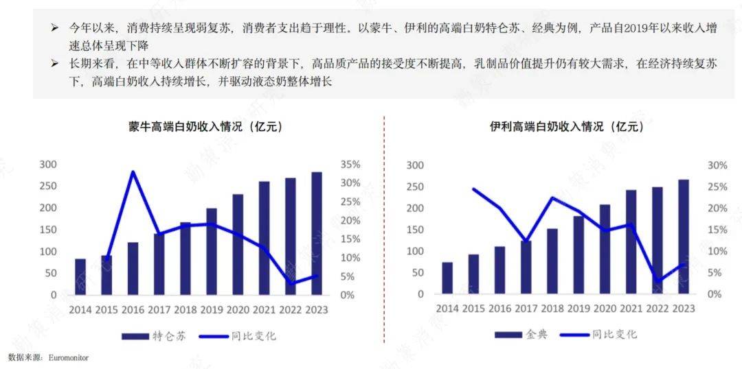 而淨利潤的重要貢獻者,就是高端奶。2023年,伊利的液態乳業務營業收入達到855.40億元,同比增長了0.72%,其中高端奶品牌“金典”有機純牛奶系列產品的零售額實現了13.5%的增長。蒙牛雖未公佈高端產品在營收中的佔比,但早在2021年,特侖蘇在蒙牛總營收中的佔比就超過了34%。