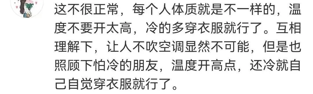 每次我開空調,還要陰陽我説年輕就是火氣大。我真的是無語,三伏天開28度還冷,到底是什麼體質啊!!!我有時候覺得冷,就自己披個小毛毯啊,老要求別人幹嘛啊,現在還不開空調不是與自然為敵嗎?現在有時候搞得我都覺得是不是我的問題了。