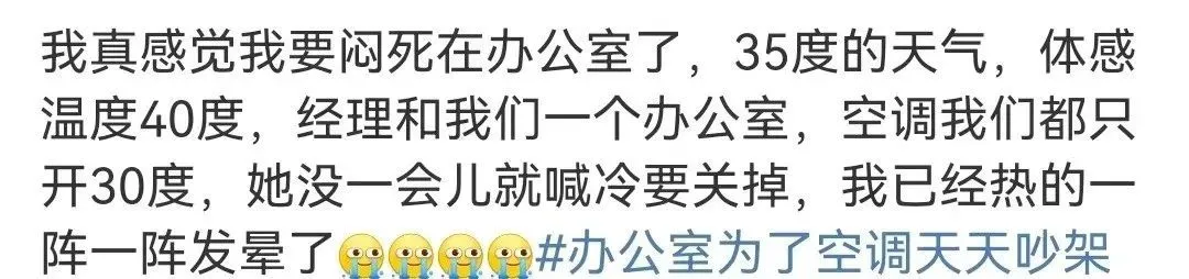 一早上從地鐵站到公司真的很熱,到辦公室就開了空調。剛打開就有人開始説了温度開高點。開了個會回辦公室,發現空調不知道又被誰關了,今天最高氣温37度啊,熱都熱死了!我説要把空調調低一點點,一直開的最低速,還説冷冷冷。
