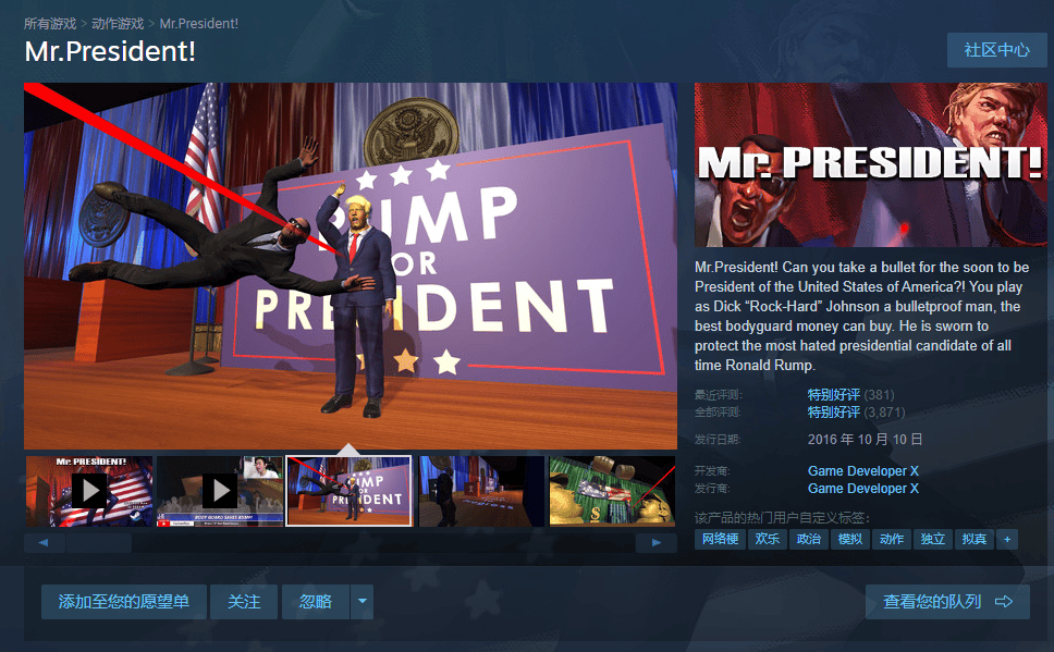 最近幾天,隨着特朗普的遇刺,一個發售於7年前的小遊戲《總統先生!》突然火了。