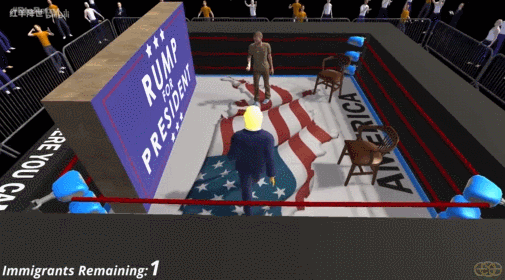 在遊戲過程中,隨着關卡的推進,遊戲場景也會隨之發生變化。比如其中一個地圖佈置在沙漠中,“朗普”站在一個講台上,背後是“建造一堵牆”的標語和焚燒着的“開放邊境”告示牌,身旁則是關在鐵籠中的“一家三口”。