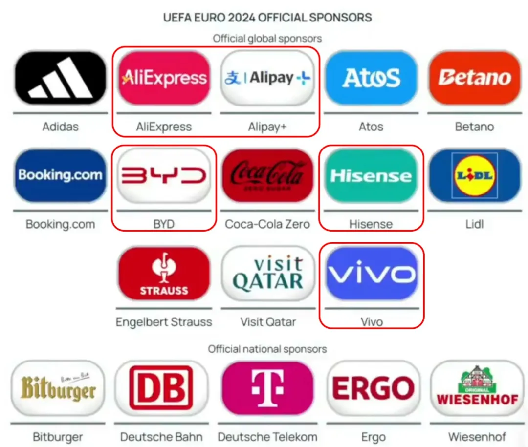 它們在VAR顯示技術、跨境電商、支付科技、官方用車和智能手機方面,為2024歐洲盃的成功舉辦保駕護航,也獲得巨量曝光。當然,它們各付出了天價廣告費用。