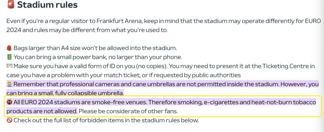 土耳其與奧地利的淘汰賽現場,大量球迷將打火機和火柴帶入球場,在比賽進行時直接在座位上吸煙,很難想象這樣煙霧繚繞的場面會在歐洲盃的現場出現,而**即便是周圍眾多球迷向工作人員投訴,也因為人手有限而無法及時制止和管控。**那場比賽後,賽事組委會做出的應對便是在賽場內反覆播放禁煙廣播,主打的還是一個靠大家自覺。