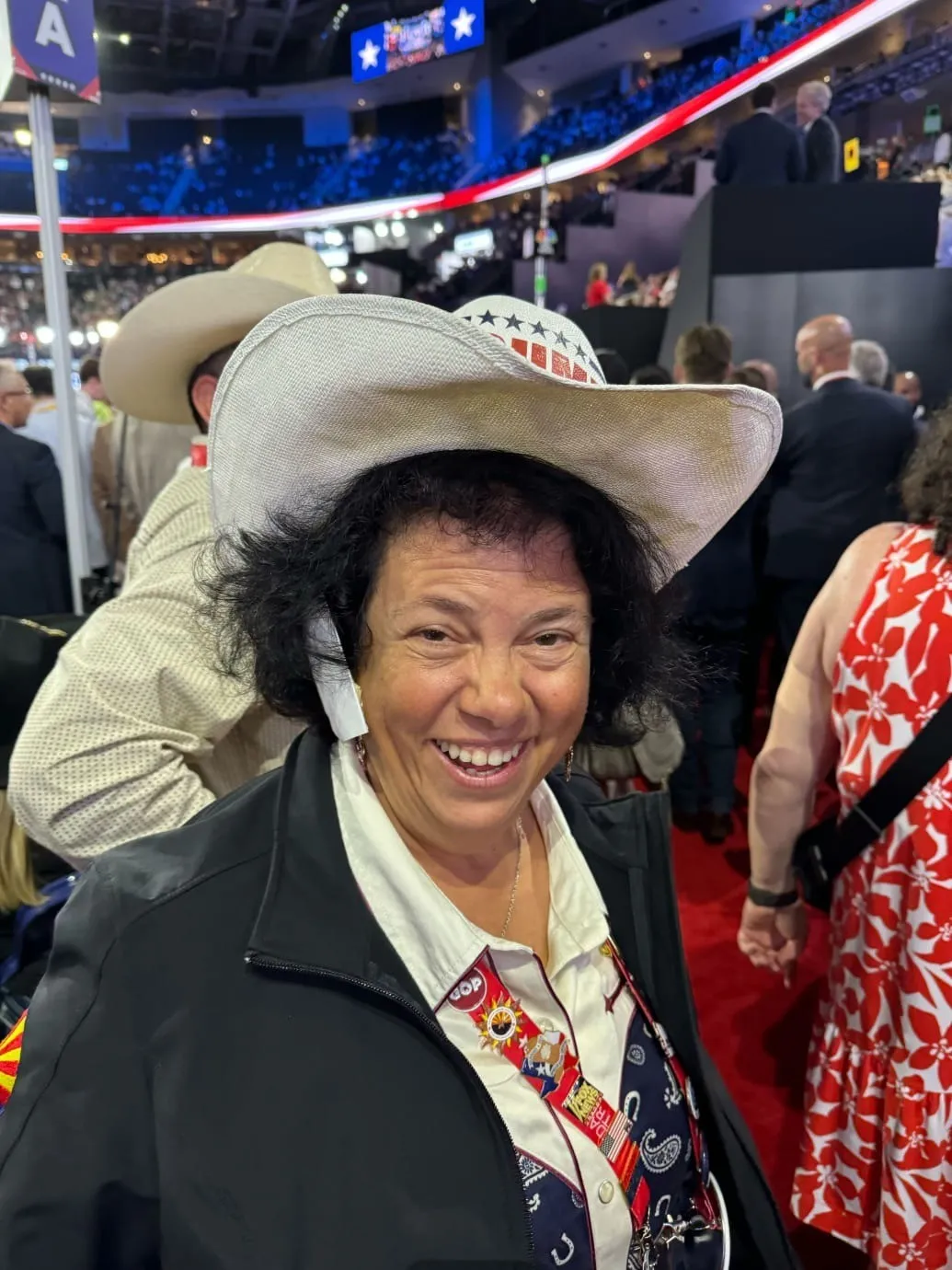 一名女士耳朵上纏着繃帶,頭戴一頂牛仔帽,脖子上用紅繩掛着共和黨的徽章。