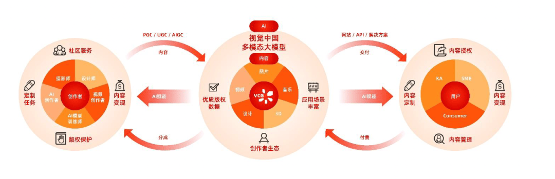 面向上游的內容創作者,視覺中國與創作者簽署授權代理協議,內容創作者可以將內容上傳或提供給平台。面向下游的內容使用者,視覺中國與客户簽署授權許可協議,客户通過授權賬號可以在平台付費下載使用內容。