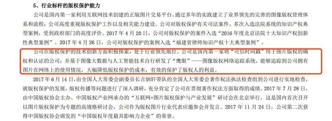 早在2017的年報中,視覺中國在核心競爭力分析一欄下提到了版權保護能力,其表示,公司基於圖像大數據與人工智能技術自行研發了“鷹眼”——圖像版權網絡追蹤系統。“鷹眼”能夠追蹤到公司擁有圖片在網絡上的使用情況,大幅降低版權保護的成本。在此技術的輔助下,視覺中國可以更好的實現維權創收。