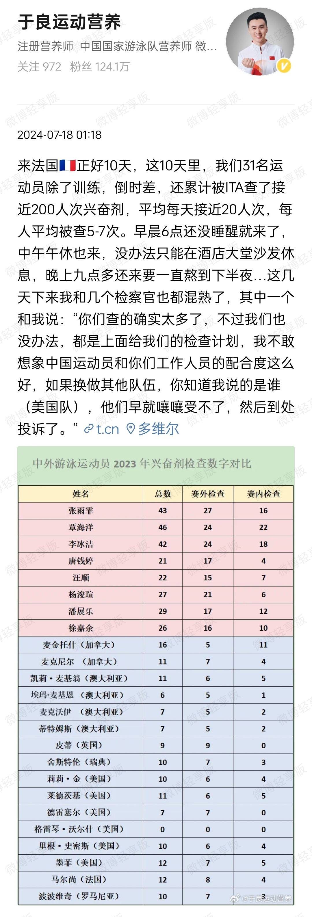 北京時間7月18日,據中國游泳國家隊營養師於良發文表示,中國游泳隊前往法國10天,全隊31名運動員被國際興奮劑檢測組織(ITA)查了近200次。