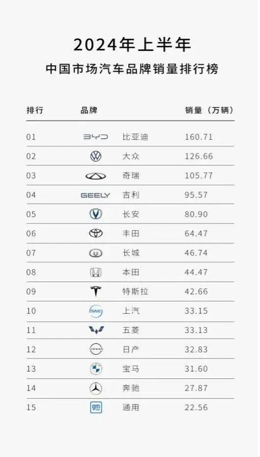 2024年上半年中國市場汽車品牌銷量排行榜