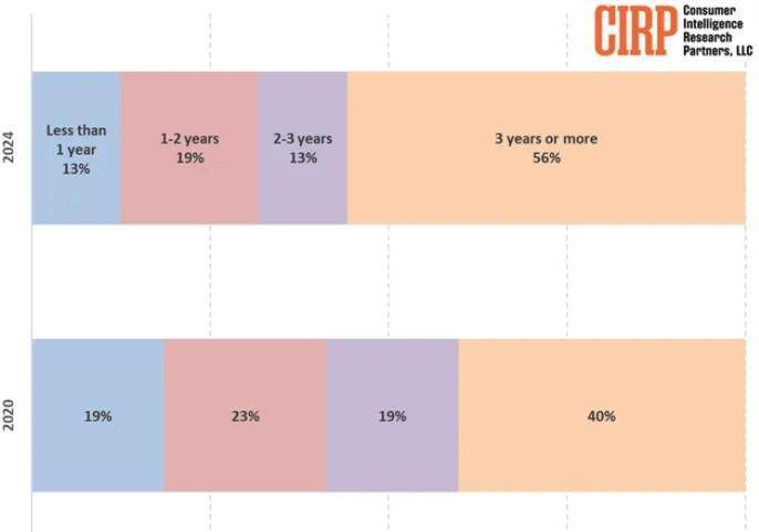 CIRP最新的數據也顯示,高淨值用户佔大多數的iPhone用户,換機週期也在持續延長,在最近12個月中,至少71%的iPhone用户和68%的Mac用户表示,他們的舊設備使用時間已超過兩年,相比2020年的63%和59%,這一比例有顯著增長。