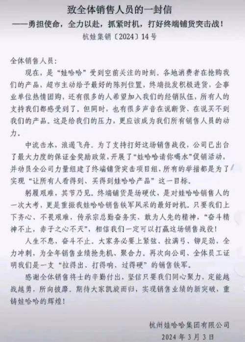 2024年3月3日,在全國消費者熱捧下,娃哈哈貨架被賣空。娃哈哈打出了洋洋灑灑、氣勢如虹的“致全體銷售人員的一封信”戰鬥檄文。
