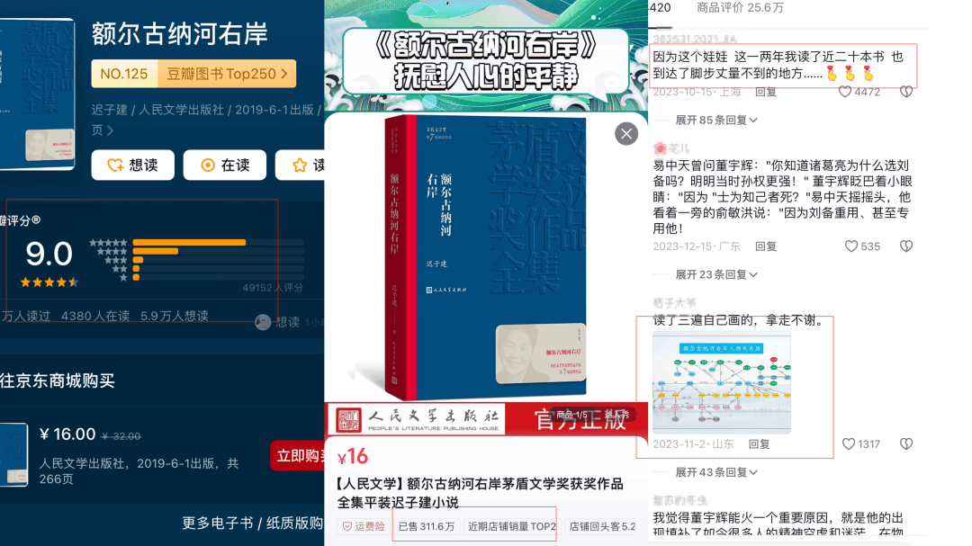 而直播間正成為年輕人買書的重要渠道,他們也在直播間裏發現好書,認識好書。以《額爾古納河右岸》為例,這部榮獲第七屆茅盾文學獎作品在董宇輝的直播間裏獲得推薦後,擴大了在年輕讀者中的影響力,在不同的短視頻渠道上不斷疊加傳播。短短一年半,總印量便超過600萬冊,是推薦前的十倍之多!