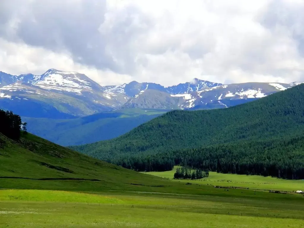 牧區內有那仁河流過,夏季氣候涼爽怡人,牛羊成羣、點點氈房、湖水漣漪、裊裊炊煙,還有阿爾泰山主峯——友誼峯,頂部常年不化的積雪,在陽光的照耀下,熠熠生輝,更有松濤陣陣,蒼鷹盤旋……