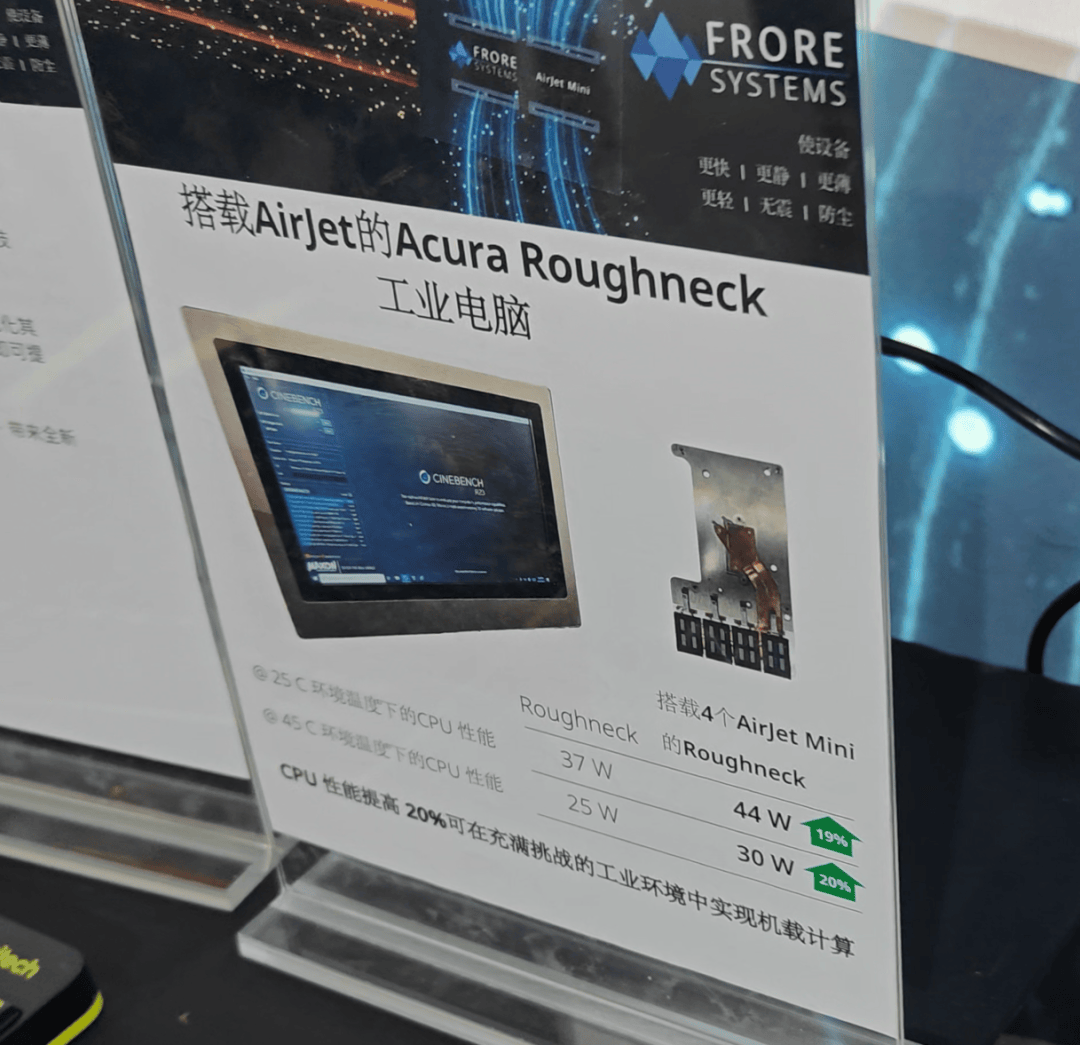 所以不少工業廠商已經盯上了 AirJet ,我看到現場他們就展示了一台在礦山裏使用的特種電腦,裏面用的就是 AirJet Mini 散熱芯片。