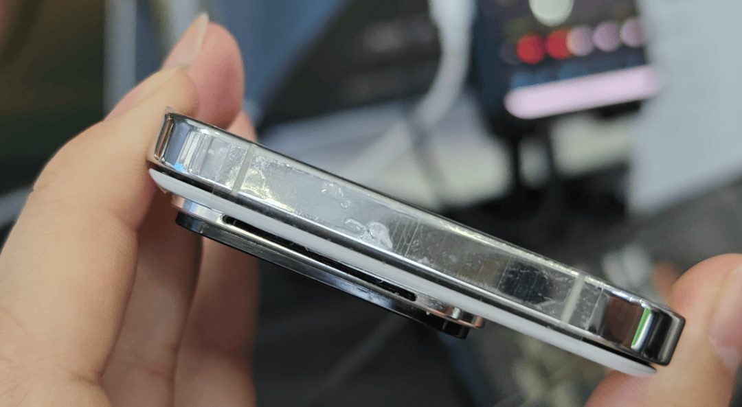 我現場摸了一下,雖然加裝了散熱芯片的小米 14 後蓋依舊嚴絲合縫沒有凸起,但是攝像頭被犧牲掉了,鏡頭 DECO 頂部還被鑽了個散熱孔。