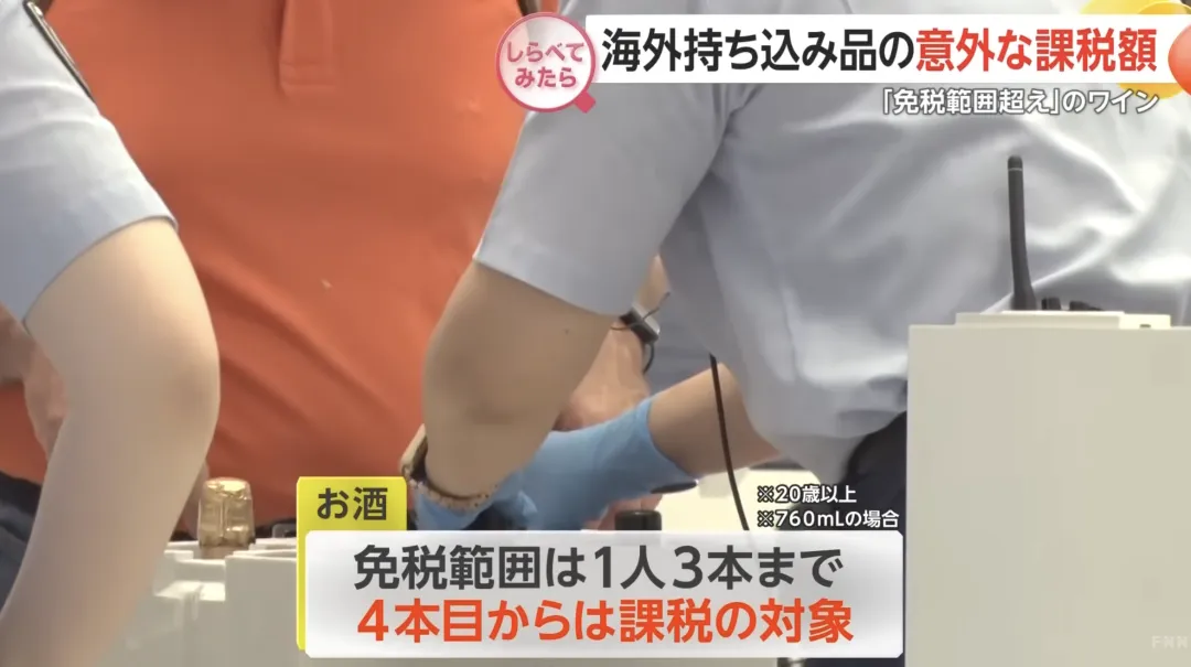 一位從意大利來日本見朋友的意大利男性,攜帶了5瓶意大利產的葡萄酒,打算送給日本的朋友,被海關攔住了,因為像這樣的普通酒,每個人可攜帶的免税額度是三瓶。於是這位意大利人需要繳納200日元的税金,200日元雖然不多,但是查驗和申報繳税的過程是需要花費一些時間的。