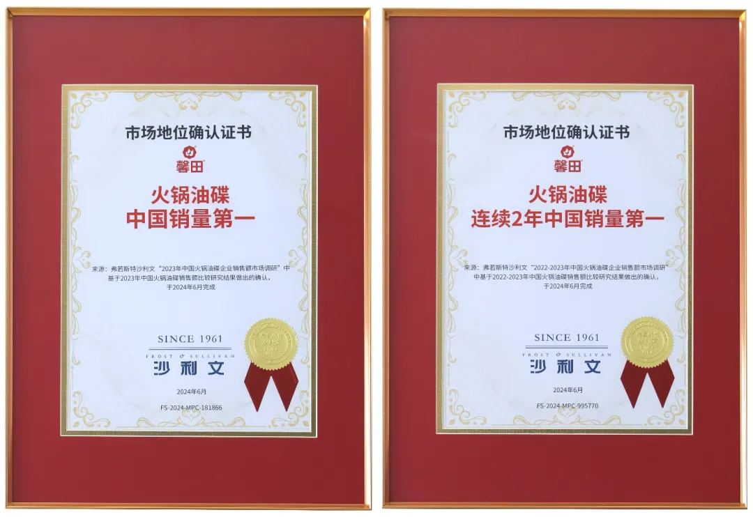 據瞭解,沙利文認證來自於客觀的行業分析和可靠的數據支持,是對企業在特定領域內的卓越表現、創新能力、市場地位等多方面的一種認可和肯定。馨田能蟬聯“火鍋油碟銷量第一”的殊榮,足以可見,品牌在火鍋油碟賽道的市場地位和影響力。