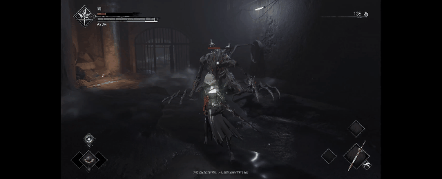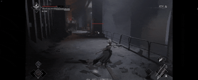 而這種以黑白陰影作為畫面主要動感部分的設計,讓遊戲的畫面敍事也更加具有“魂味兒”。比如中間這一段玩家在下水道偶遇失控機兵的戰鬥橋段,除了上面提到過的光影變化成為了玩家視野中的主要動態部分以外,主角與失控機兵手上的那一抹紅色同樣奪人眼球,再加上失控機兵扭曲的身體和詭異的行動方式,更讓那抹紅色變得病態與刺眼,將魂系熱衷的“黑暗與瘋狂的故事”以視覺刺激的形式向玩家娓娓道來。