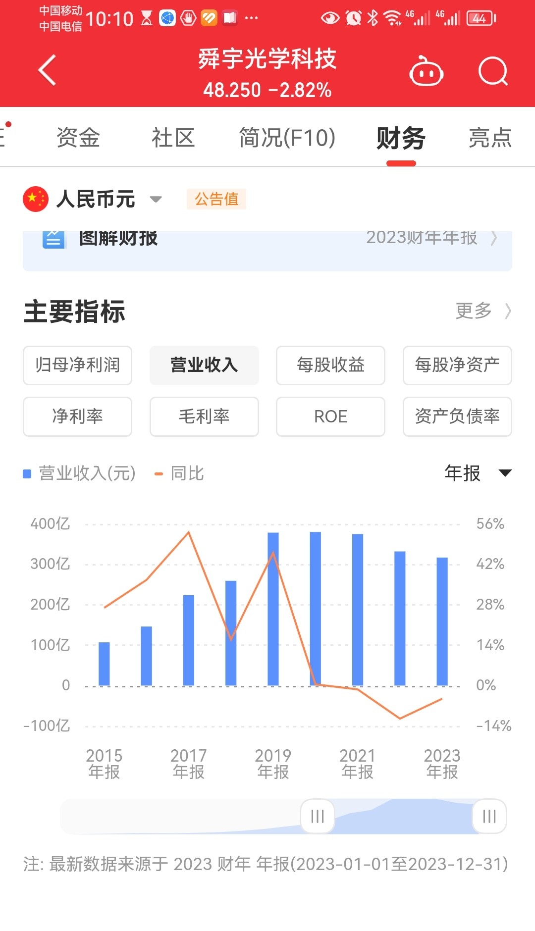 時間回到2023年,舜宇光學由於生產問題流失了iPhone鏡頭訂單,導致其在蘋果光學供應中的比重降到極低。當年其收入體量也再度下滑。財報顯示,2023年舜宇光學總營收同比上一年下滑4.6%。