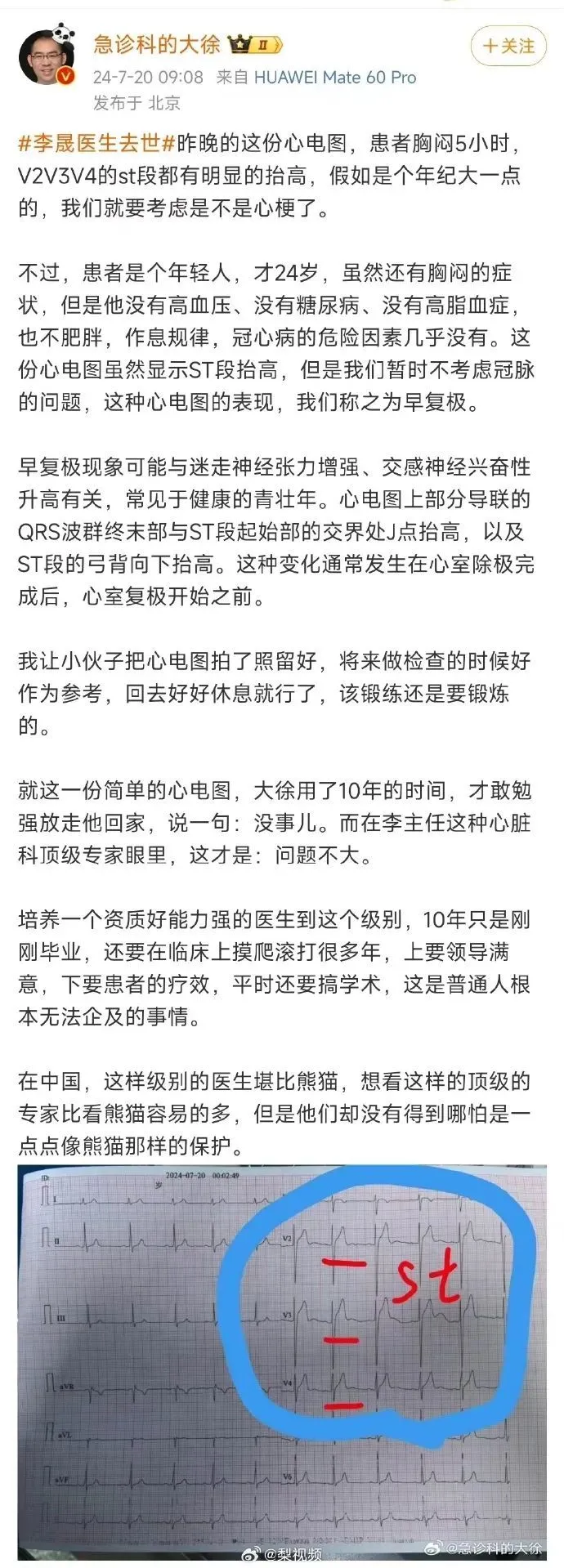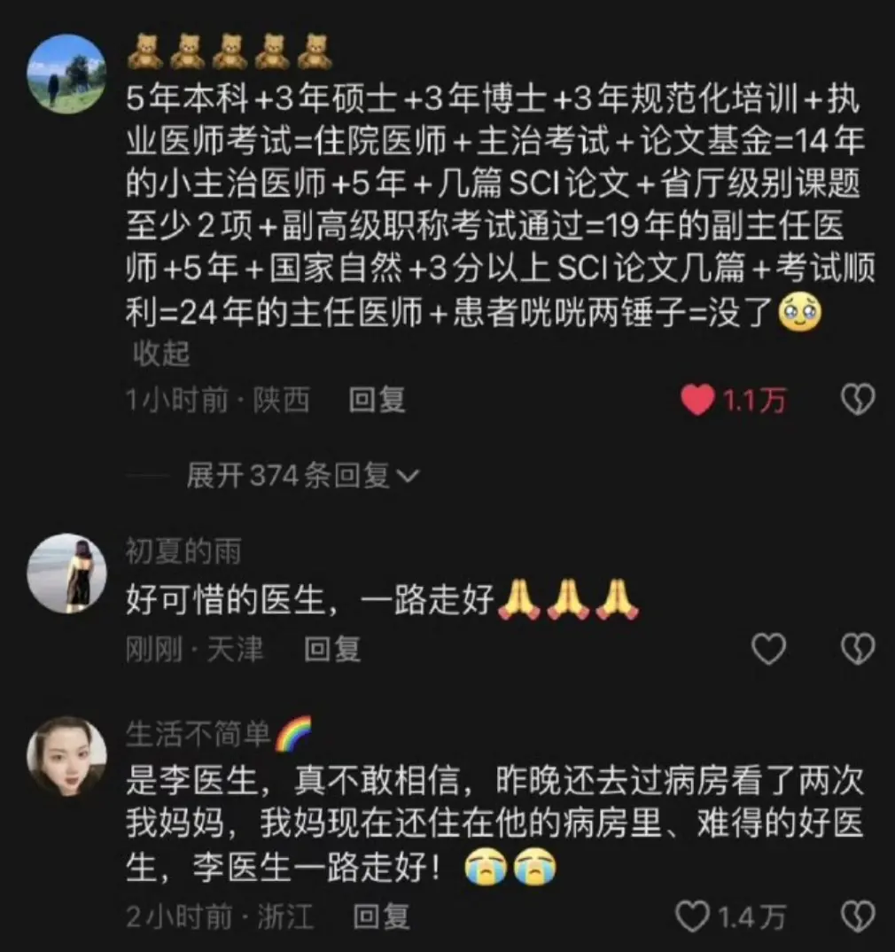 7月20日,清華大學第一附屬醫院急診內科主治醫師徐海軍@急診科的大徐 發文稱,培養一個資質好能力強的醫生到李晟這個級別,10年只是剛剛畢業,還要在臨牀上摸爬滾打很多年,上要領導滿意,下要患者的療效,平時還要搞學術,這是普通人根本無法企及的事情。在中國,這樣級別的醫生堪比熊貓。