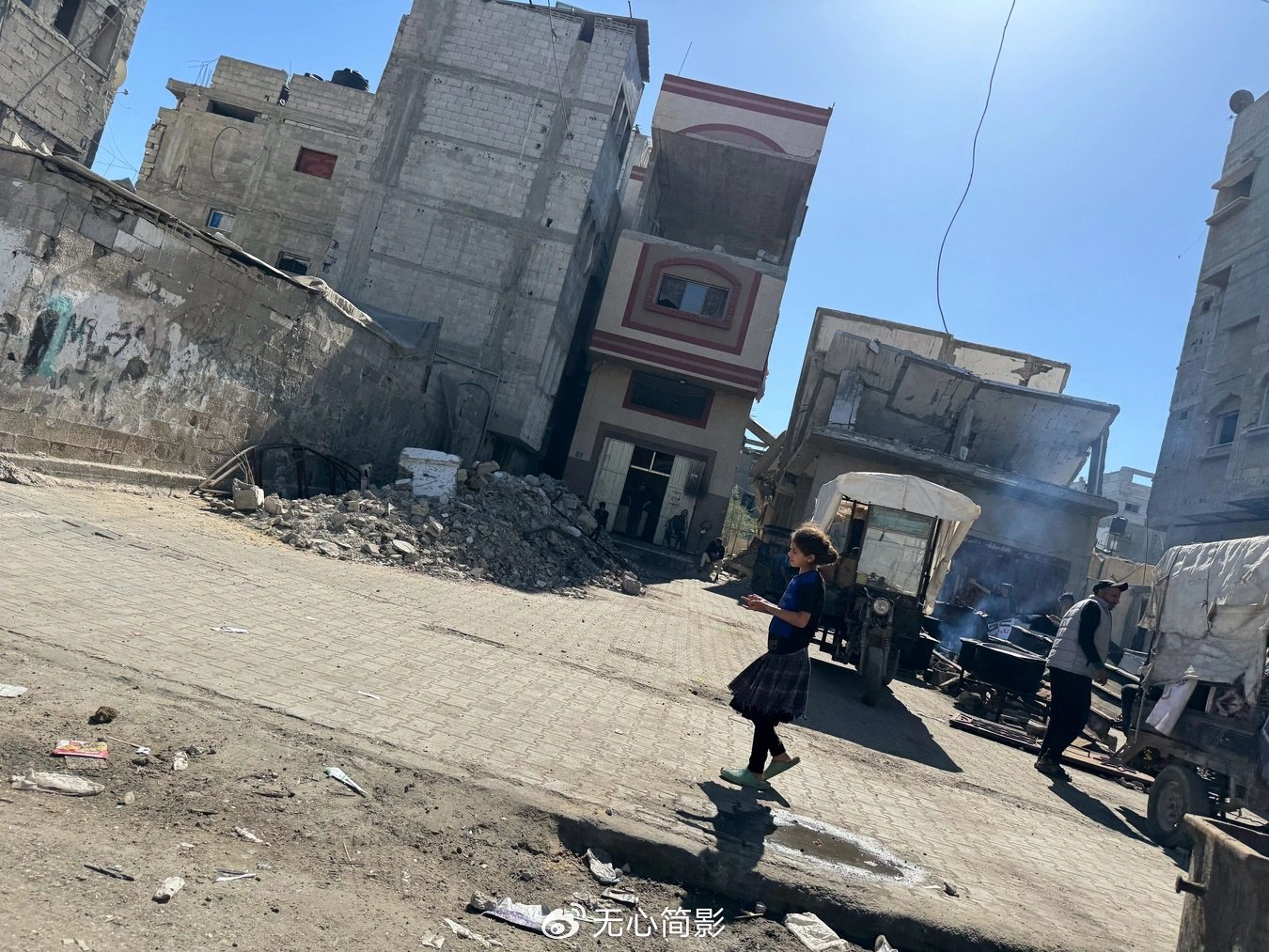 一名女孩走過拉法被炸燬的建築物。在加沙的醫院遭到大面積破壞後,現在大約有 1400 張急症病牀,來供 220 萬人使用。