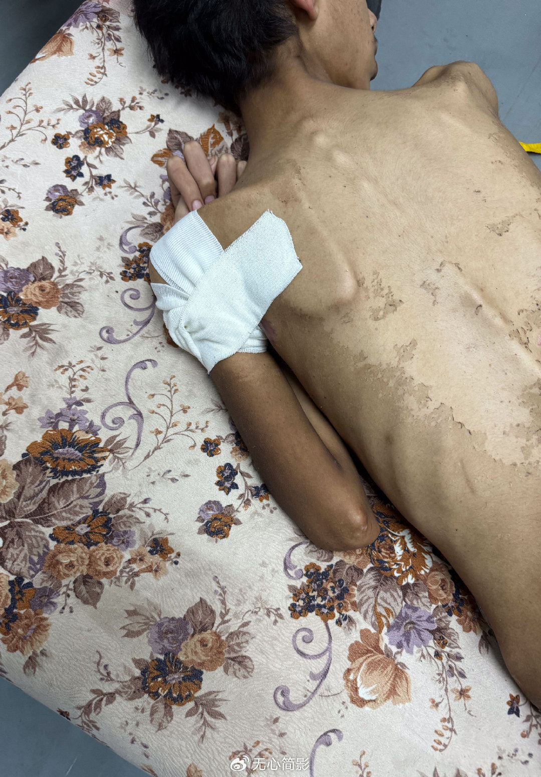 一張 10 歲男孩的照片,他一個月前頭部中彈並接受了顱骨切除術。西德瓦醫生拆掉了頭皮上的縫線