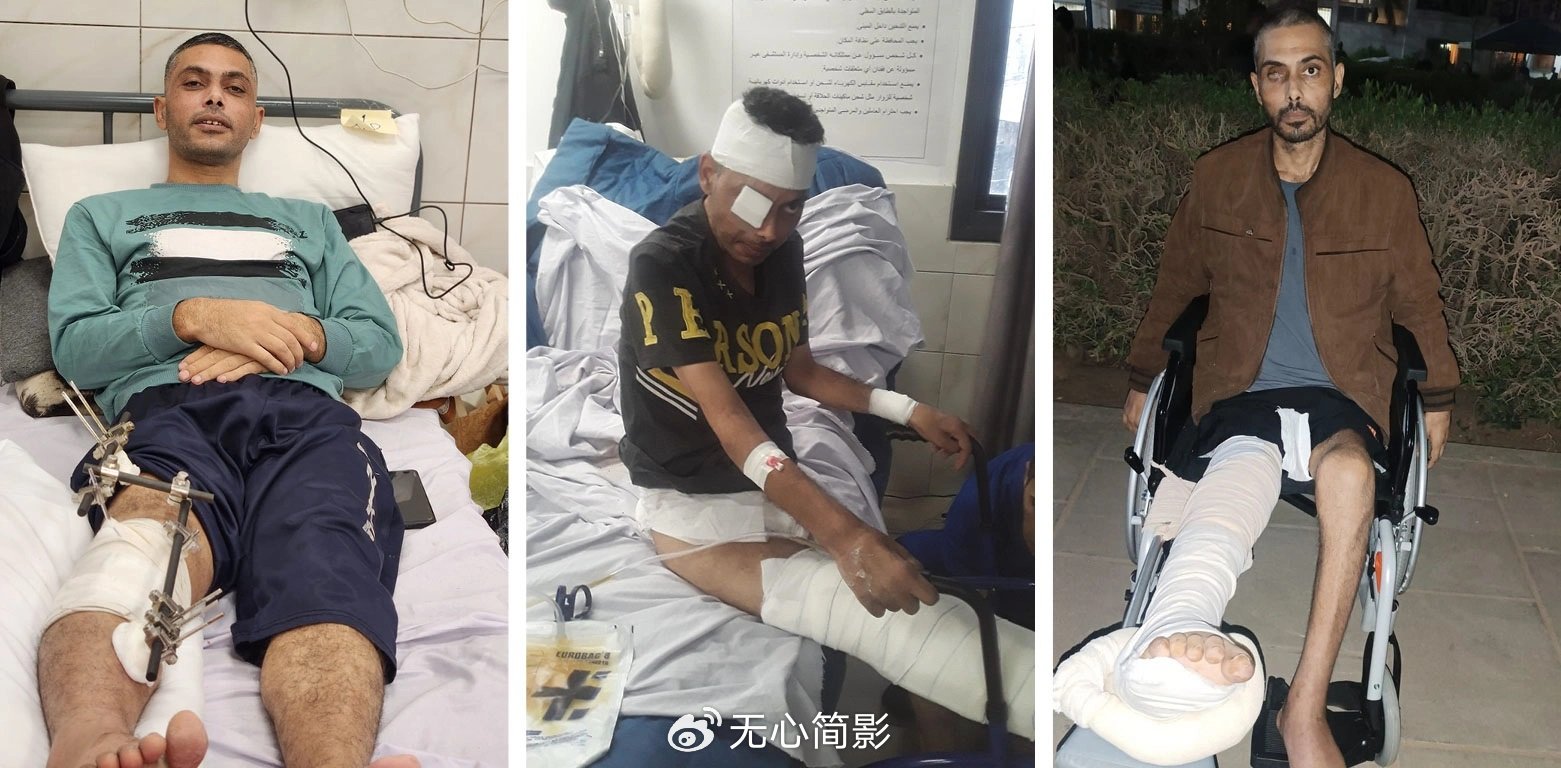 塔梅爾在 Facebook 上發佈的照片,顯示了他中彈並接受手術後(左)、從以色列拘留所獲釋後(中)和在加沙歐洲醫院接受治療後(右)的情況。