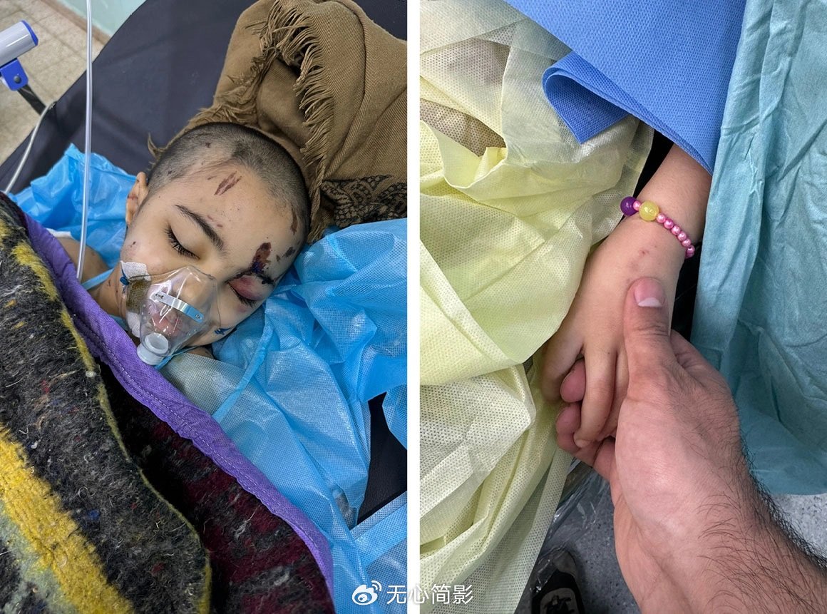 左圖:朱莉,9歲,接受了多次手術。為了有機會完全康復,朱裏還需要幾十個小時的手術和幾天的兒科重症監護室,而這些條件在加沙已經不存在了。右圖:西德瓦握着朱裏的手