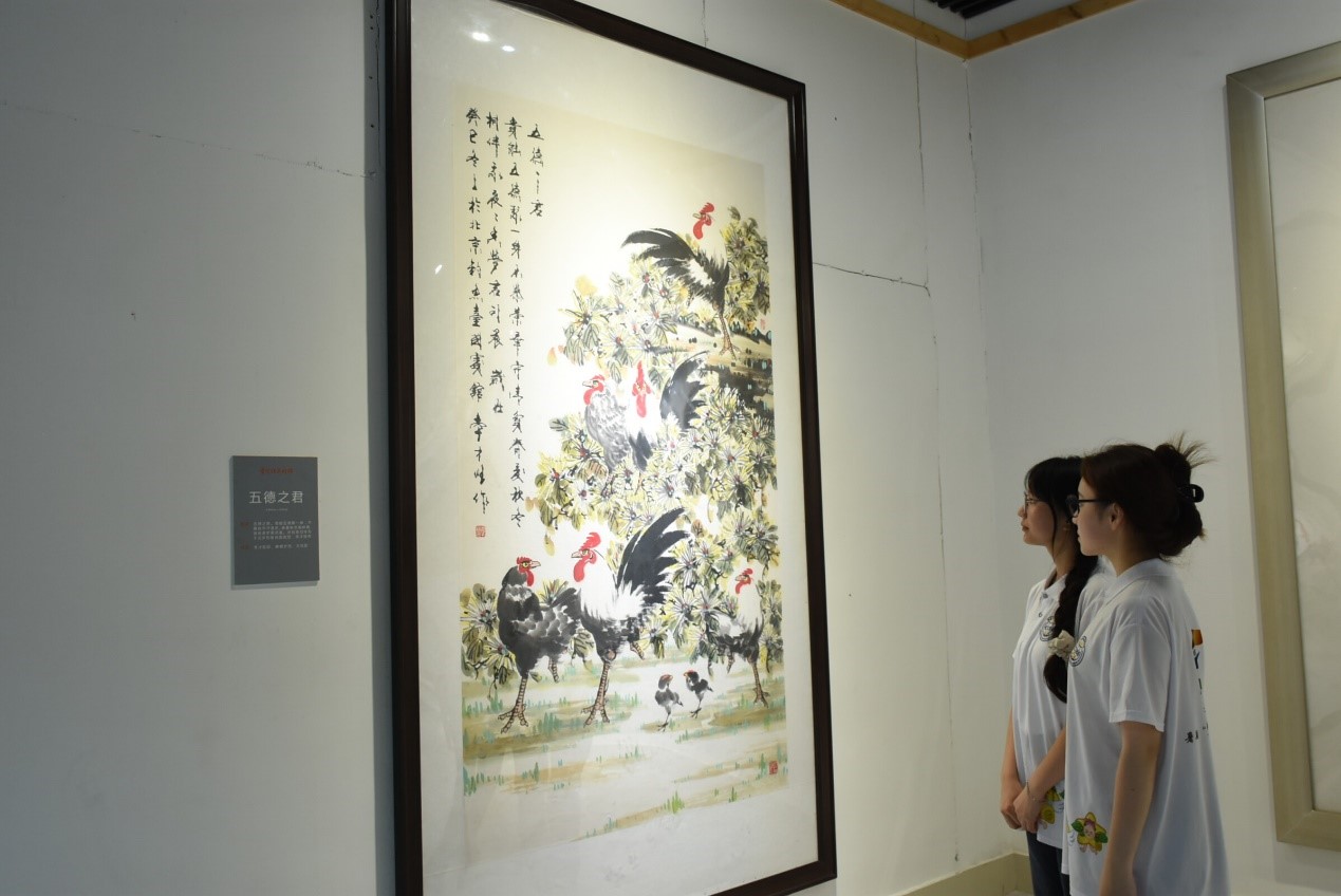 圖片依次為團隊成員賞析書法作品、團隊成員欣賞李才旺先生《五德之君》的畫作、展廳中李才旺先生的書法作品、展廳中李才旺先生的繪畫作品、活動結束後的合照