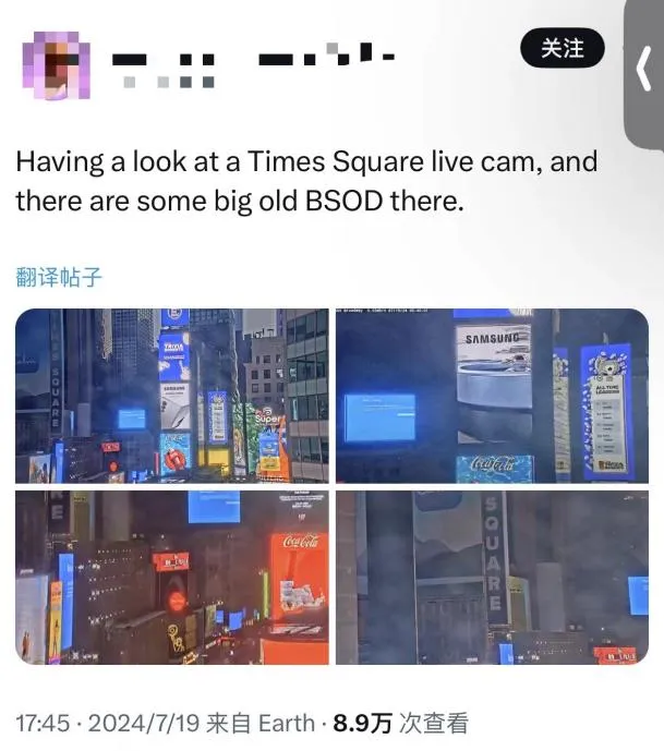 辦公室的小小藍色屏幕不算啥,更具衝擊力的是走出辦公室之後,發現商場前的大屏、機場大大小小的屏幕、超市收銀系統,甚至是街邊碩大的電子廣告牌,全都“藍”了,角落裏的悲傷顏表情直擊人心。