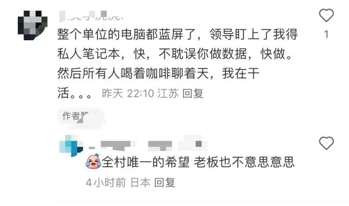 另一些人的不開心,來自幾乎全公司電腦都藍了,除了自己。謝謝微軟,坐實了自己“天選牛馬”的身份。