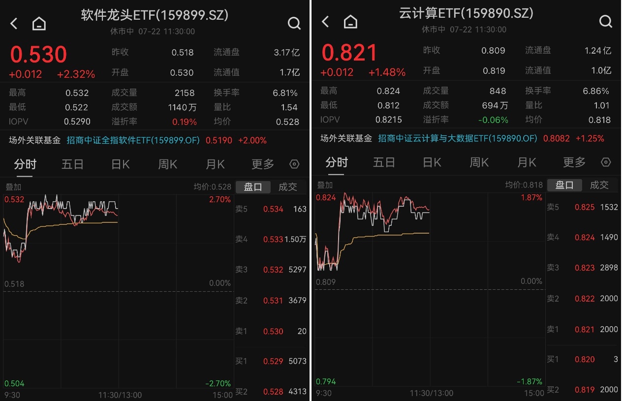 ETF方面,受成份股齊漲提振,軟件龍頭ETF(159899)半日收漲2.32%,雲計算ETF(159890)上漲1.48%,雙雙強勢領漲。