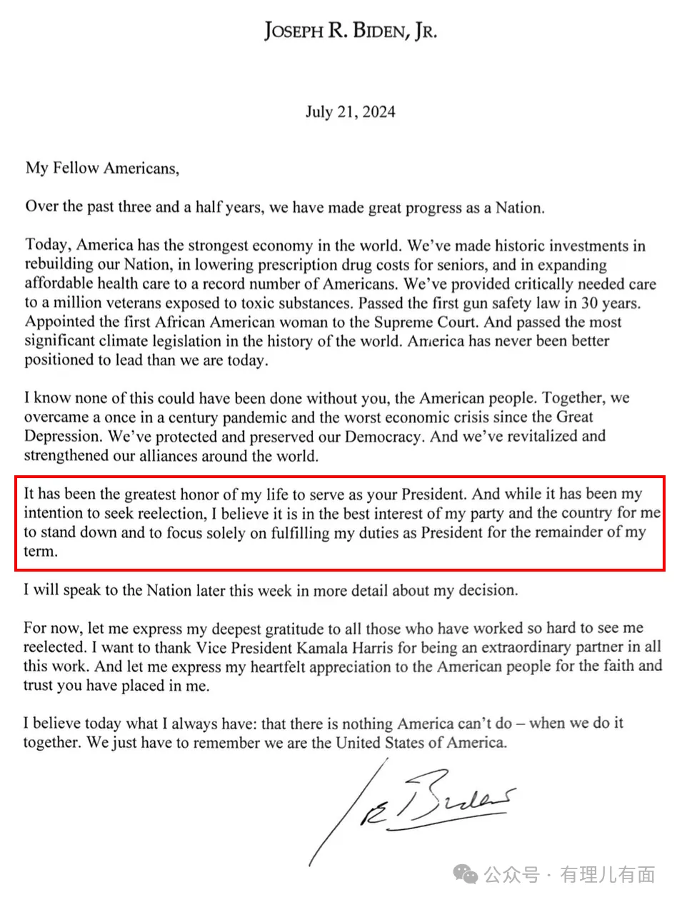 拜登發佈的公開信,內容包括對自己三年半來政績的回顧,和一句美國人藏在心底、期待已久的話:雖然我一直想競選連任,但我認為,為了政黨和國家的最大利益,我最好退出,專心履行總統的職責,完成餘下的任期。