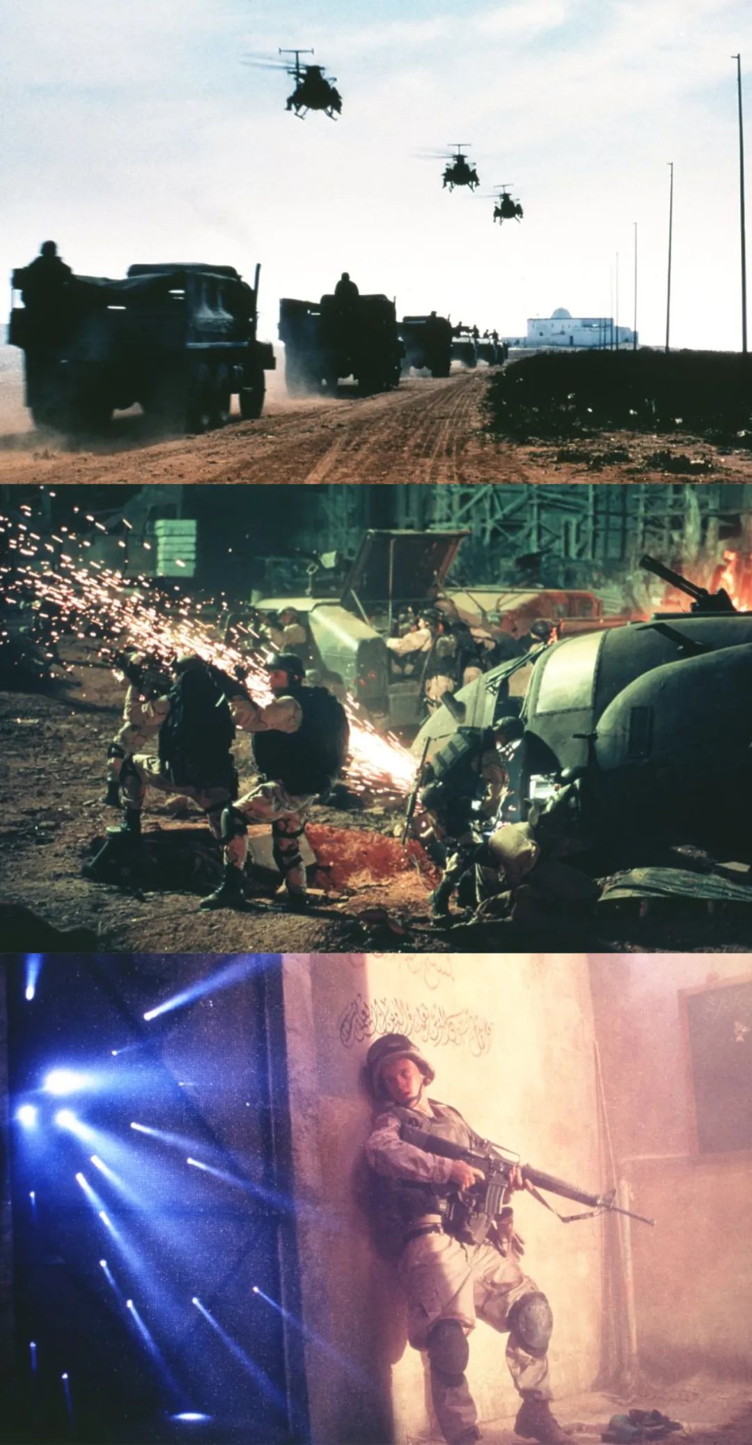 **《黑鷹墜落》**取景摩洛哥荒漠,一比一還原軍隊的武器裝備,連現場的槍炮聲也是真實錄音。