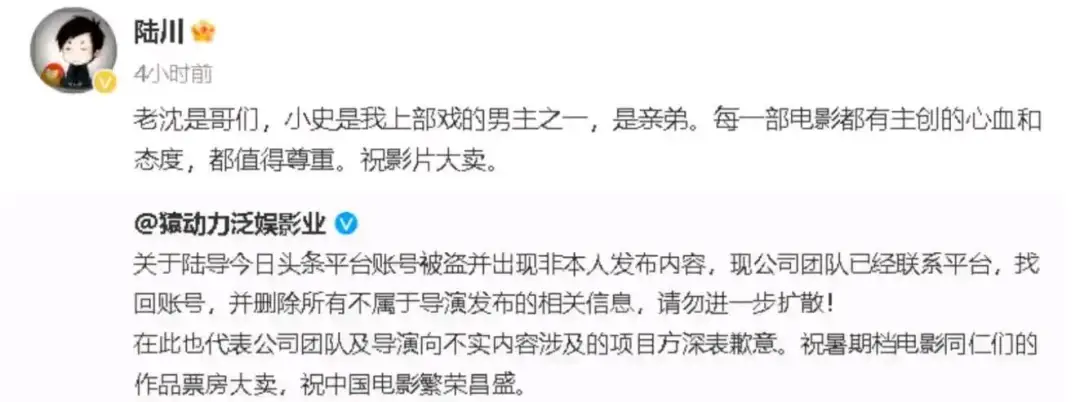 既能做到爆笑,還能做到反應實際,把喜劇背後的悲劇完整的展現出來,這在任何一個評價體系中都理應是部優秀的影片,然而該片不僅在豆瓣只有7.4分的評價,還被知名導演陸川評價為“文化的悲哀”,評價了吧又後悔,轉頭説自己被盜號,我和沈騰賊鐵,然後又被頭條官方打臉,説你這發帖手機就是你自己,和澄清的帖子一模一樣,大家信他不如信我是秦始皇。