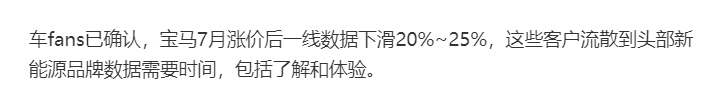 結果還沒倆月,寶馬想法變了,官方説法是**“ 重點關注業務質量,支持經銷商穩紮穩打 ” 。**我翻譯翻譯,就是説價格戰我不玩了,車子得漲回去。