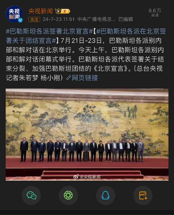 根據新華社消息,7月23日,巴勒斯坦內部各派別和解對話會閉幕式之後,有關各方簽署了關於結束分裂狀態、加強巴勒斯坦內部團結的《北京宣言》,在巴勒斯坦內部各派別的整合,形成巴勒斯坦人民的統一戰線反抗復國主義邁出了關鍵性的一步。