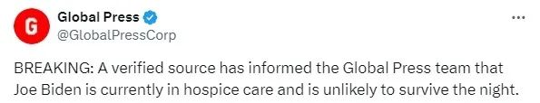 “一個經過核實的消息人士告訴全球新聞團隊,喬·拜登目前正處於臨終關懷階段,很可能活不到今晚。”