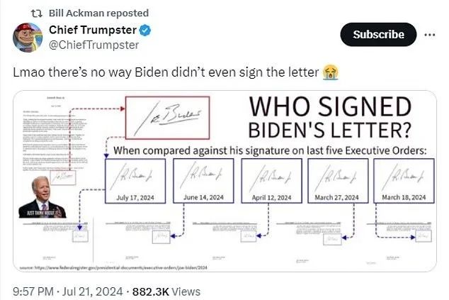 有網友開始研究拜登退選聲明上的簽字,他們表示,對比拜登過往的簽字之後可知,這封信肯定不是拜登本人寫的!