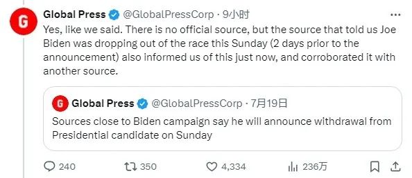當有人質疑消息來源的真假時,這個賬號放出了他們19號爆料拜登將在週日宣佈退選的消息,表示目前確實沒有官方消息來源,但他們這個消息,是爆料拜登退選的那個人泄露給他們的,保真。