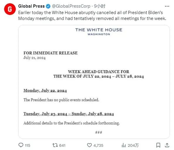 在早些時候,白宮突然取消了拜登週一的所有會議,並暫時取消了本週的所有會議。