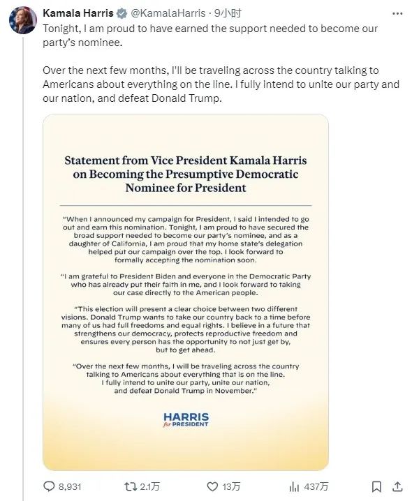 對了,最後再提一句,在拜登宣佈迴歸的同時,民主黨又宣佈了另一個消息,那就是哈里斯已經正式成為了民主黨提名候選人。