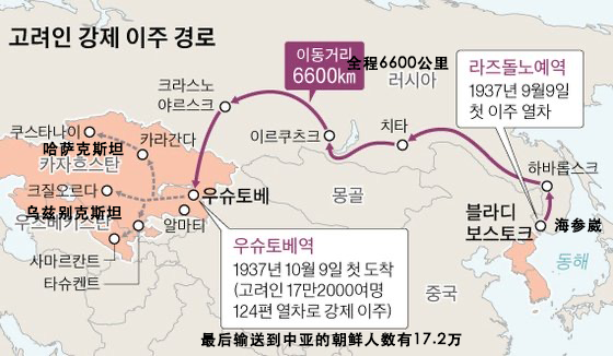 為防患於未然,蘇聯在遠東局勢動盪之際(即日本發起全面侵華戰爭),以國家安全為由將朝鮮人遷出邊境,並安置在後方的中亞地區。1937年被強制遷往中亞的朝鮮人有17萬左右,約9.5萬遷至哈薩克斯坦,7.5萬遷至烏茲別克斯坦。