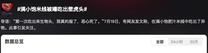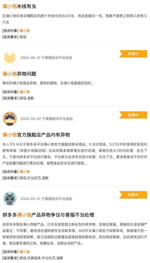 「滿小飽米線裏有蟲子,吃了一半發現一隻蛆……」「在李佳琦直播間買的滿小飽肥汁土豆粉,裏面一根打卷的頭髮……」