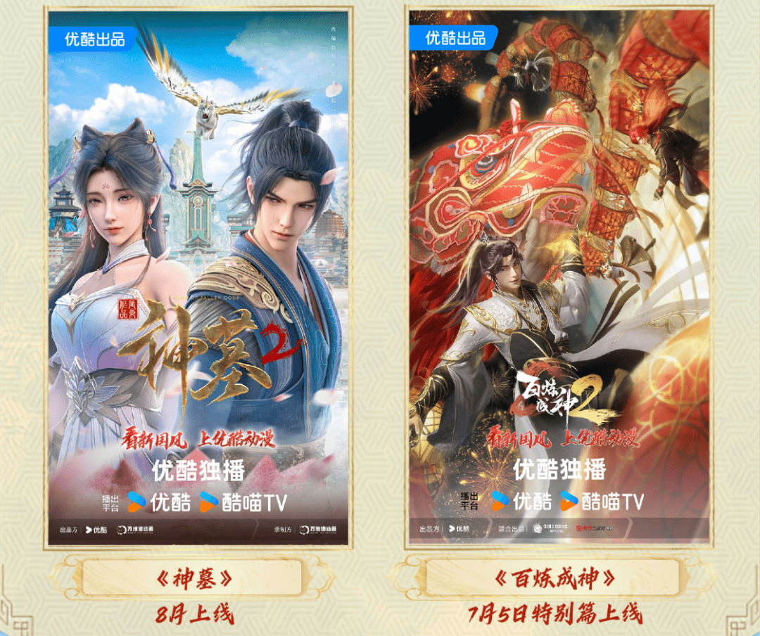 優酷於去年推出的《百鍊成神2》《冰火魔廚2》以及《仙武傳》,今年暑假仍然處於更新狀態,分別佔領優酷動漫週五、週六、周天的檔期。週末“黃金檔期”交由年番,足見其重要性。