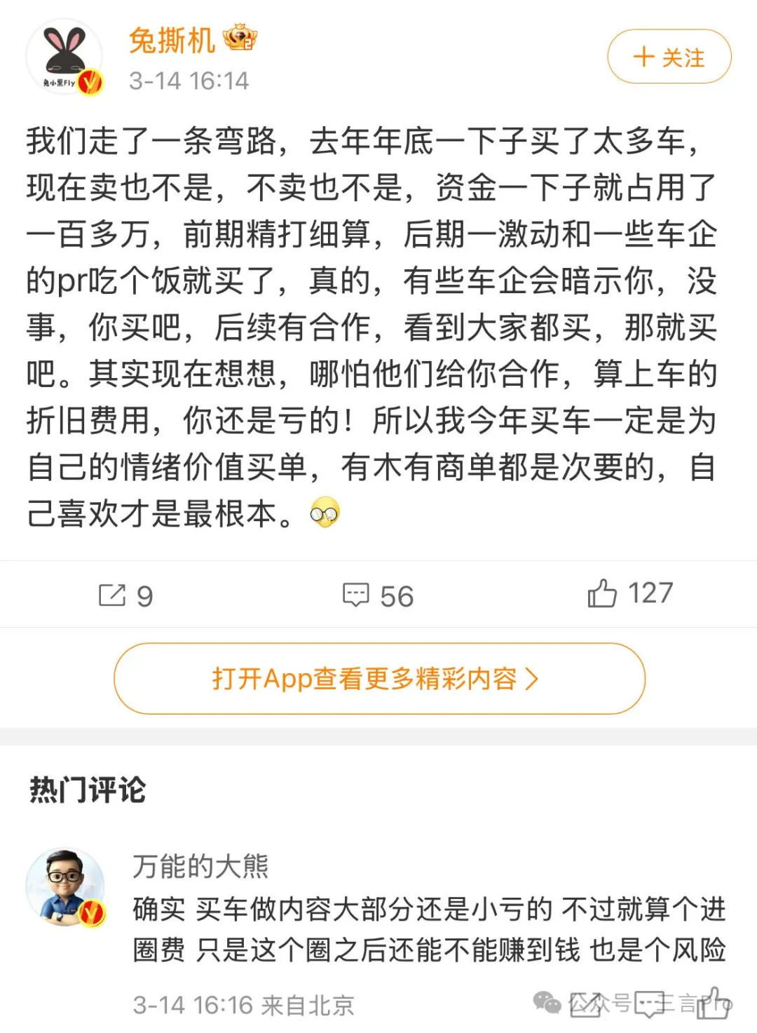 微博博主萬能的大熊也表示,買車做內容大部分還是小虧的,不過算個進圈費,只是進了圈還能不能賺到錢,也是個風險。