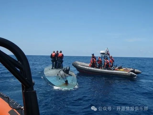 2015年7月19日,海岸警衞隊斯特拉頓號登船小組正在調查一艘在中美洲海岸國際水域被攔截的自航式半潛式船隻。斯特拉頓號船員從這艘40英尺長的船隻中搜出了超過6噸的可卡因。