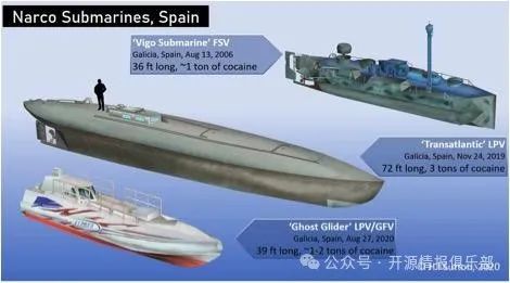 西班牙毒品潛艇有三種類型:Vigo型 FSV、Transatlantic型和LPV、Ghost Glider型LPV/GFV。