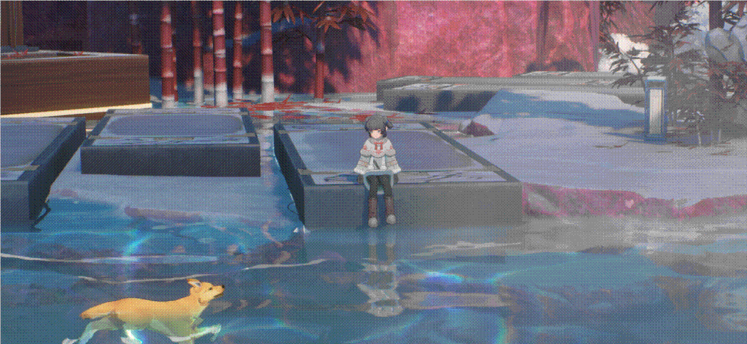再比如角色在乘霄山呆久了,屏幕上會出現雪花凍結的痕跡,而虹鎮周圍的温泉可以緩解這種狀況,併為角色恢復血量和體力——到温泉旁邊,你還能見到同樣悠閒的小狗小貓,以及坐在池邊搖腿的小女孩。